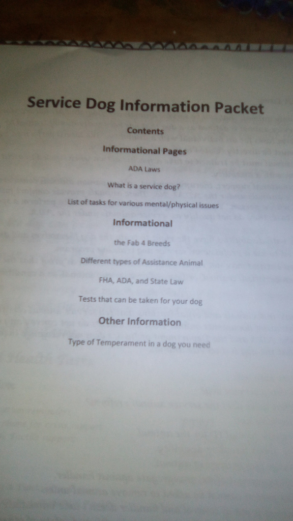 My Service Dog Informational Packet is filled with information that a new handler would need to know such as possible tasks. The different laws for the FHA, ADA and other laws. It is packed full of information and helpful links as well So you can be fully prepared for your new partner :)