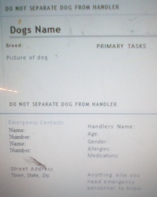 My Therapy dog cards are packed full of useful information. These cards can be customized in any way. The information contained is useful for people who may not understand that your dog is allowed to be with you in these places so they can help other people.