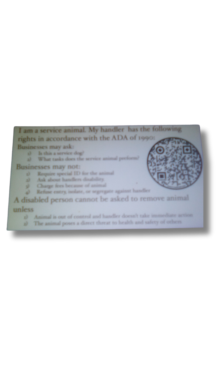 My Emotional Support Animal cards are packed full of useful information. These cards can be customized in any way. The information contained is useful for people who may not understand that your dog is not a service dog no matter what your circumstances are.